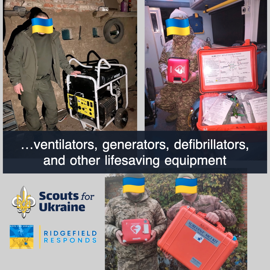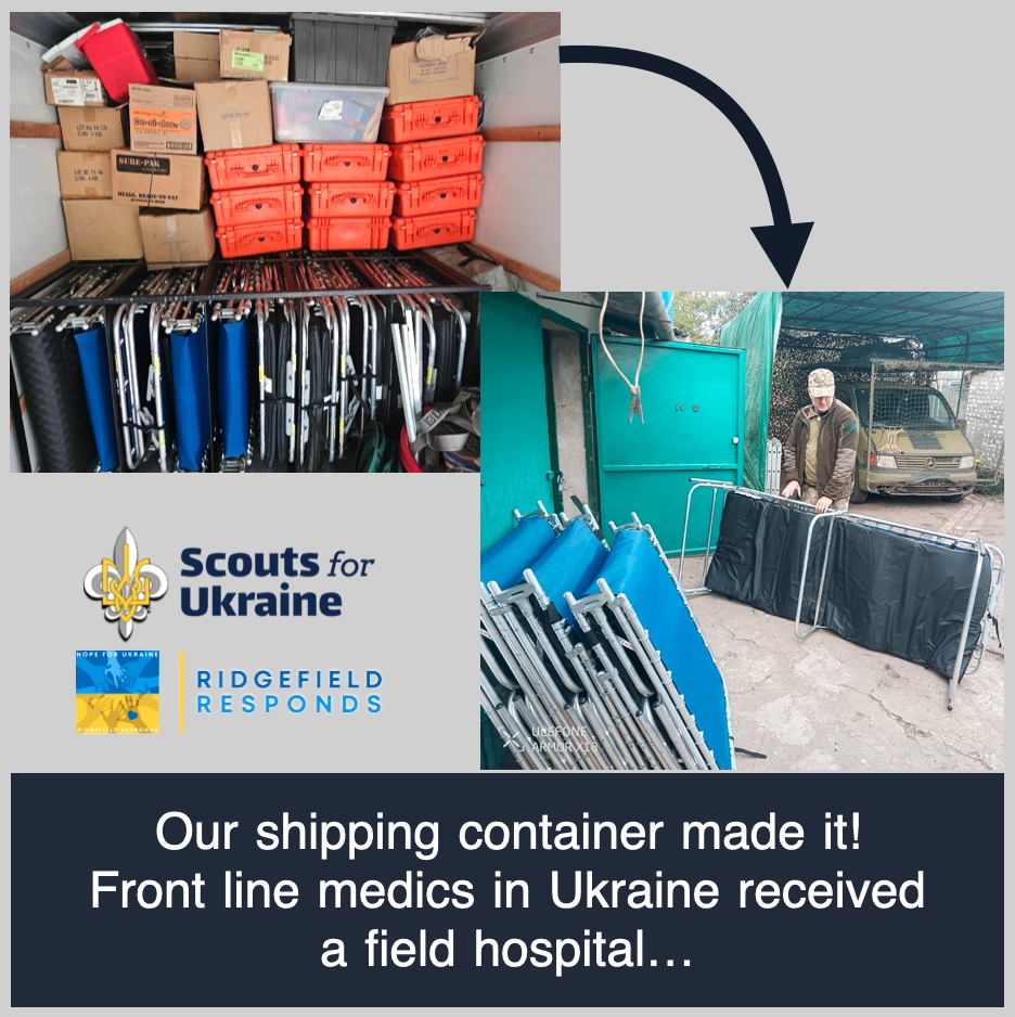 «Scouts for Ukraine» отримали щедру пожертву необхідного медичного приладдя для України. До неї увійшли польовий шпиталь на 50 паціентів, зокрема аптечки першої допомоги, кисневі вентилятори, розкладачки й ліжка, намети, генератори, та інше обладнання. Разом із організацією «Ridgefield Responds» ми підготували, упакували на піддони, завантажили, та відправили цей цілий контейнер медичної допомоги рятувальникам на передову в Україні. «Scouts for Ukraine» покрили витрати у розмірі $7,800 на збір засобів і міжнародної доставки. Ми також контролювали маршрут доставки, щоб ці життєво необхідні матеріяли потрапили безпосередньо медичним працівникам на передовій в Україні.